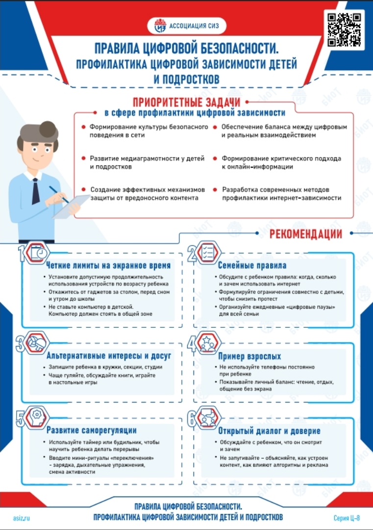 В современном мире цифровые устройства стали неотъемлемой частью нашей жизни. К сожалению, цифровые устройства не только облегчают и упрощают процесс обучения, но одновременно несут и риски цифровой зависимости детей, утечки данных, кибербулинга и другие. Ассоциация разработчиков, изготовителей и поставщиков средств индивидуальной защиты (Ассоциация «СИЗ») в связи с началом нового учебного года, а значит ещё одного года активной цифровой жизни миллионов детей и подростков, подготовила серию инфографик по цифровой безопасности. Восемь наглядных модулей по правилам цифровой безопасности закроют базовое понимание вопроса, подскажут, на что обратить внимание и как предупредить негативные последствия.