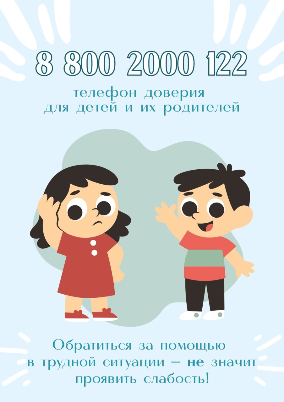8-800-2000-122 — единый общероссийский номер детского телефона доверия. При звонке на этот номер в любом населённом пункте России со стационарных или мобильных телефонов дети, подростки и их родители могут получить экстренную психологическую помощь.